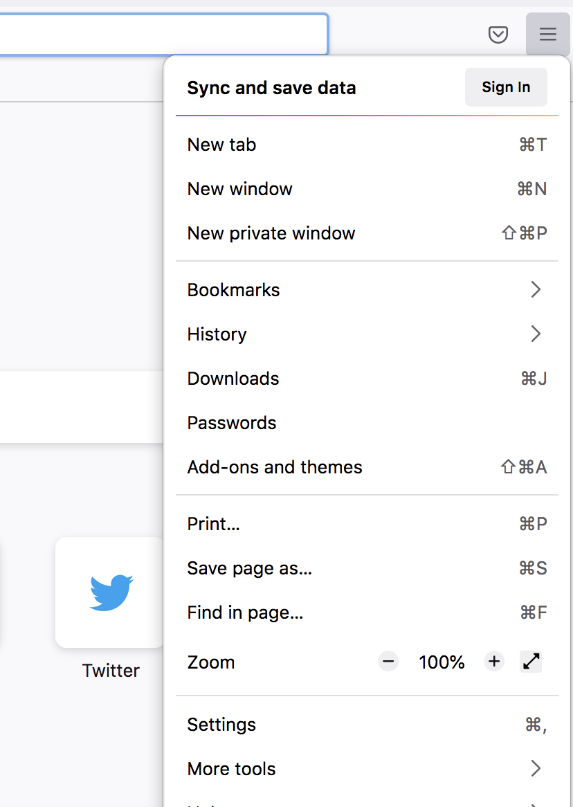 The menu button will be in the top right-hand corner of Firefox; it looks like three horizontal lines on top of each other.
